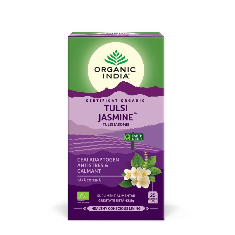 Ceai Tulsi (Busuioc Sfant) Iasomie – Ceai Adaptogen Antistres si Calmant, eco, 25 de plicuri, Organic India Ceaiul Tulsi (Busuioc Sfant) Iasomie, Ceai Adaptogen Antistres & Calmant este un produs 100% Certificat Organic si nu contine organisme modificate genetic. Nu contine si nu sunt folosite in niciun stagiu al productiei pesticide sintetice, erbicide, ingrasaminte sau alte tratamente chimice. Ceaiul Tulsi (Busuioc Sfant) Iasomie, Ceai Adaptogen Antistres & Calmant contine un amestec ambrosial al iubitei plante medicinale indiene Tulsi, cu musetel calmant si flori de iasomie parfumata. Perfect pentru pentru a-ti recapata calmul interior si intelepciunea. Ingrediente Informatii Nutritionale: Portie 1 plic infuzie (aprox. 240ml) Ingrediente – cantitate per plic: flori de Musetel (Matricaria chamomilla) 50% frunze de Tulsi Rama (Ocimum sanctum) 14% frunze de Tulsi Krishna (Ocimum sanctum) 12,8% seminte de Fenicul (Foeniculum vulgare) 10% frunze de Tulsi Vana (Ocimum gratissimum) 8,2% aroma naturala de Iasomie 4% flori de Iasomie (Jasminum sambac) 1% In India, Tulsi (cunoscut si sub denumirea de Busuioc Sfant) este considerat ,,Regina Plantelor Medicinale si este venerat ca planta sacra, cu putere vindecatoare. Tulsi este cultivat in mod traditional intr-un vas de lut in orice casa sau gradina, iar beneficiile sale pentru sanatate sunt in mod repetat amintite in manuscrise Indiene vechi de pana la 5.000 de ani. In hinduism, Tulsi este vazut ca o zeita in forma unei plante care a fost inzestrata cu extraordinare puteri spirituale si vindecatoare. Potrivit legendelor, nicio cantitate de aur nu putea cantari mai greu decat puterea Krishnei, insa o singura frunza de Tulsi pusa cu dragoste si devotament reusea sa incline balanta. Cercetarile moderne au clasificat Tulsi ca planta adaptogena sau planta ce sustine sistemul imunitar si indeparteaza efectele negative ale stresului si anxietatii, creste vitalitatea si rezistenta organismului, este energizant, bogat in antioxidanti, sprijina digestia, incetineste procesele de imbatranire a organismului, regleaza metabolismul, sustine procesele naturale de detoxifiere, mentine sanatatea tractului respirator, are proprietati antiinflamatorii. Tulsi contine acid ursolic, cu rol in inhibarea enzimelor producatoare de inflamatii COX-2, eficient in stimularea detoxifierii organismului si reducerea inflamatiilor. Beneficii Antistres si energizant natural Adaptogen Sustine organismul in a se proteja de efectele negative ale stresului Poate avea rol benefic in starile de anxietate, agitatie psihica, depresie Poate conferi un efect relaxant si stare de bine imediat dupa consum Poate contribui la imbuntatirea starii psihice Sprijina digestia Sustine sanatatea metabolismului Sustine sanatatea sistemului imunitar Abunda in antioxidanti responsabili de diminuarea stresului oxidativ Benefic in raceala si gripa Fara microplastic (plicuri celulozice nealbite) Mod de administrare Cate 1 plic de 3 ori pe zi. Sigur pentru folosire indelungata. Recomandare pentru cele mai bune rezultate: Turnati apa fierbinte peste plicul infuzie intr-o ceasca mare. Acoperiti pentru 5-10 minute sau mai mult. Veti descoperi aroma deosebita cu fiecare inghititura. Folositi 2 plicuri daca pregatiti pentru consum rece, cu gheata. A nu se depasi doza recomandata pentru consumul zilnic. Fara gluten – Kosher – Fara cofeina In cazul in care alaptati sau sunteti insarcinata, consultati medicul inainte de consum. Suplimentele alimentare sunt menite sa suplimenteze dieta si nu trebuie sa inlocuiasca o dieta variata. A se pastra la loc uscat si racoros. A nu se lasa la indemana copiilor. Certificari ORGANIC INDIA Ceai Tulsi (Busuioc Sfant) Iasomie, Ceai Adaptogen Antistres & Calmant este: Certificat Organic de Uniunea de Control – 801983 Produs si procesat respectand standardele NPOP ale Indiei si USDA-NOP Certificat Organic de USDA (United States Department of Agriculture) Certificat Organic conform standardelor UE Produs NON GMO (nemodificat genetic) Notificare: SNPMAPS, 15032/2021 Toate produsele ORGANIC INDIA contin Plante 100% Certificate Organic, ceea ce inseamna ca nu se folosesc pesticide sau fertilizatori sintetici in niciun stagiu al productiei. Toate plantele sunt recoltate exclusiv de la agricultorii nostri, iar metodele unice de cultivare, recoltare si procesare le protejeaza integritatea nutritionala. Produsele ORGANIC INDIA promoveaza sanatatea, fericirea si ,,Adevarata Stare de Bine si sunt realizate cu grija si iubire. Fiecare dintre produsele noastre intruchipeaza dragostea, respectul si legatura dintre Natura Mama, fermieri, compania noastra si dumneavoastra. Muncim alaturi de mici familii in cultivarea a mii de hectare de teren agricol in mod ecologic si sustenabil pentru a oferi o viata demna agricultorilor indieni si pentru a va oferi dumneavoastra sanatate si fericire. Alegand ORGANIC INDIA participati si dumneavoastra activ la misiunea noastra de a crea un mediu inconjurator sustenabil!