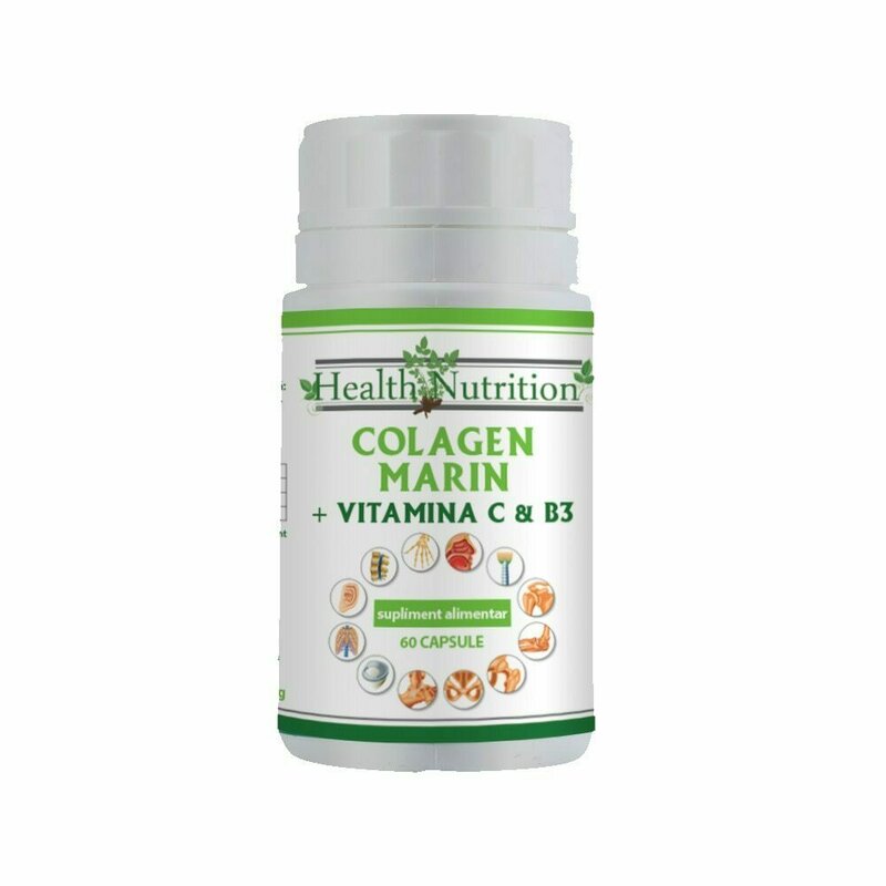 Colagen marin Forte + Vitamina B3 + Vitamina C, 60 tablete – Health Nutrition Colagenul este principala proteina structurala care se gaseste in diverse tesuturi conjunctive. Fiind principalul component al tesutului conjunctiv, colagenul este cea mai raspandita proteina din corp, reprezentand aproximativ 25% pana la 35% din cantitatea totala de proteine. Se gaseste majoritar in tesuturi conjunctive fibroase: tendoane, ligamente, piele, muschi, oase, vase de sange si sistemul digestiv. Datorita lui, pielea are elasticitate si fermitate, iar acesta contribuie si la inlocuirea celulelor moarte de la nivel cutanat. Colagenul formeaza o retea de celule ale tesutului conjunctiv pe care se pot aseza si multiplica alte celule, contribuind astfel la regenerarea celulara. Pe masura ce inaintam in varsta, productia de colagen incepe sa scada. De aceea apar ridurile, iar articulatiile incep sa slabeasca. Intrucat productia de colagen scade pe masura ce inaintam in varsta se recomanda suplimentarea aportului de colagen. Colagenul marin impreuna cu Vitamina C si B3 sprijina sanatatea si elasticitatea pielii, intarirea rezistentei oaselor si articulatiilor, imbunatatirea digestiei, stimularea cresterii si a rezistentei parului si unghiilor, mentinerea senzatiei de satietate, accelerarea cicatrizarii si vindecarii ranilor, tonifierea globului ocular, recuperarea muschilor dupa efort, mentinerea elasticitatii vaselor de sange, refacerea tesuturilor si flexibilitatii plamanilor, reducerea ridurilor fine, mentinerea sanatatii dintilor si gingiilor. Mod de utilizare: 1-6 comprimate pe zi, pentru adulti. Ingrediente/capsula: Colagen marin (peste) – 400 mg, capsula: hidroxipropilmethilceluloza, acid asorbic/ vitamina C – 89 mg, agent de incarcare: celuloza microcristalina, nicotinamida/ vitamina B3 – 18 mg, agenti de antiaglomeranti: saruri de magneziu ale acizilor grasi, dioxid de siliciu. Valori Nutritionale ingrediente active 1 capsula % VNR* Colagen 400 mg** Vitamina C 80 mg / 100 % Vitamina B3 16 mg / 100 % *VNR = Valoare Nutritionala de Referinta calculata cf Regulament 1169/2011 ** Doza zilnica nu a fost stabilita Efecte: Colagenul este principala proteina structurala din corpul uman si joaca rol vital in buna functionare a oaselor, tendoanelor, ligamentelor, cartilagiilor si pielii. Vitamina C contribuie la formarea normala a colagenului, sprijinind functionarea normala a vaselor de sange si functionarea normala a oaselor si a pielii. Niacina (B3) contribuie la mentinerea sanatatii pielii. Prezentare: Flacon cu 60 capsule.
