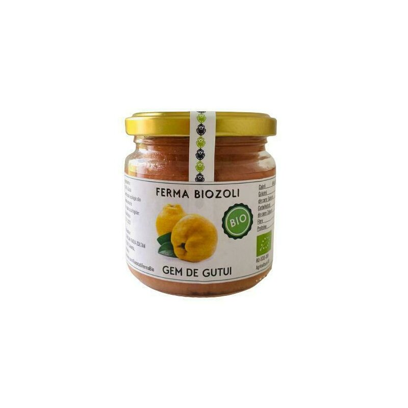 Gem de gutui, fara zahar, bio, 200gr, Ferma Biozoli   Produs provenit din ferma proprie, 100% natural, fara zahar, ecologic. Gemul contine doar gutui, fara alt aditiv sau indulcitor.   Ingrediente:  100% gutui* *din agricultura ecologica   Fabricat in Romania   Borcan de sticla   200g