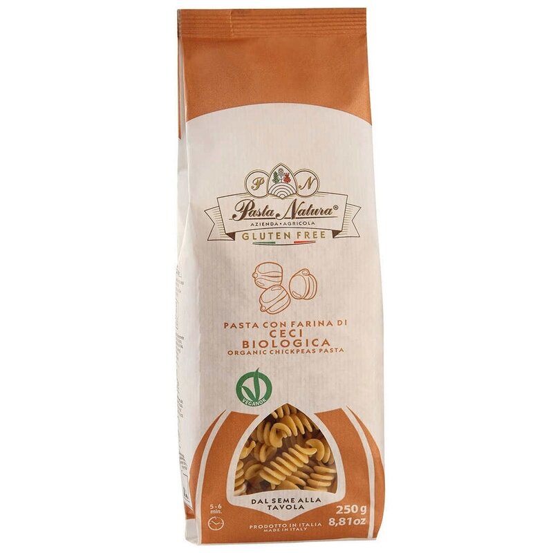 Paste din naut, porumb si orez, bio, fara gluten 250g Pasta Natura Paste bio vegane fara gluten, fabricate de maestri italieni pentru garantia calitatii si a gustului desavarsit. Ingrediente: faina de naut*, faina de porumb*, faina de orez*. *din agricultura ecologica Timp de fierbere: 5-6 minute. Pastele cu faina de naut sunt bogate in proteine, si fara colesterol. Cu siguranta pentru sportivi si persoanele active, pastele cu naut se pot integra usor in dieta zilnica datorita aportului proteic ridicat. Uscate la temperaturi joase, pastele cu faina de naut sunt alegerea perfecta pentru orice membru al familie. Pastele cu faina de naut sunt usor digerabile datorita continutului de fibre. Sunt bogate in vitaminele B si C, precum si in minerale ca fierul, fosforul, calciu. Sfaturi pentru gatit: Pastele cu faina de naut merg bine cu salvie, rozmarin, ceapa rosie si varza. O reteta simpla este cea cu broccoli si usturoi. Valori nutritionale/100g: Energie: 1468 kJ/347 kcal Grasimi: 4.1g din care saturate 0.8g Carbohidrati: 60g din care zaharuri 2.1g Fibre: 5.1g Proteine: 15g Saruri: 0.02g Fabricat in Italia intr-o cooperativa agricola. Produs certificat bio, Vegan, fara gluten. 250g