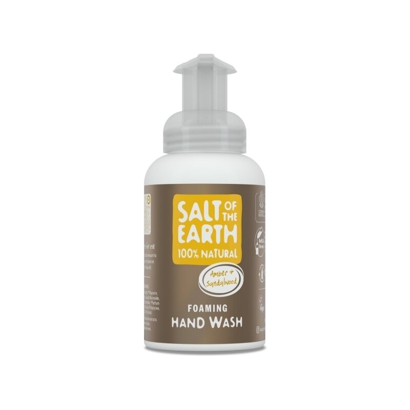 Sapun lichid spumant cu chihlimbar si lemn de santal, Salt of the Earth, 250 ml   Sapun spumant 100% natural, vegan si cruelty free – aroma: chihlimbar & lemn de santal Mentine mainile curate in mod natural.   Acest sapun spumant este luxuriant, fara conservanti si SLS / SLES. Are un pH echilibrat si contine ingrediente naturale pentru a-ti mentine mainile curate si catifelate pe toata durata zilei.   Cantitate: 250 ml   Cu o spuma instanta bogata si matasoasa, sapunul Salt of the Earth va deveni modul tau favorit de a-ti curata mainile in mod natural.   Beneficii:   ·          certificat COSMOS natural – ingrediente 100% naturale ·          un sapun spumant bogat si matasos ·          se clateste repede, astfel incat vei folosi mai putina apa ·          recipient din plastic 100% reciclat ·          fara conservanti ·          cu pH echilibrat ·          aprobat de societatile vegetariene si vegane ·          produs in UK   Ingrediente: apa, decil glucozida, glicerina**, propilen glicol**, lauril glucozida, disodiu cocoil glutamat, parfum (aroma)*, acid P-anisiz, polilizina, acid fitic, acid citric. (*din extracte botanice si uleiuri esentiale naturale; **derivat vegetal).   Mod de utilizare: Aplica o cantitate rezonabila pe mainile ude, spala si clateste. Atentie! Doar pentru uz extern. Evita contactul cu ochii. In caz de contact cu ochii, clateste cu apa din abundenta. In caz de iritatii, inceteaza utilizarea. Nu folosi produsul pe pielea iritata sau cu rani deschise.