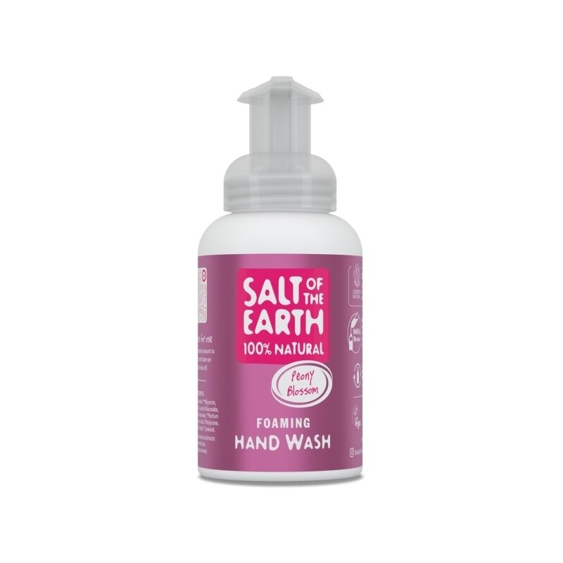 Sapun lichid spumant cu floare de bujor, Salt of the Earth, 250 ml   Sapun spumant 100% natural, vegan si cruelty free – aroma: floare de bujor Mentine mainile curate in mod natural. Salt of the Earth Peony Blush Foaming Hand Wash   Acest sapun spumant este luxuriant, fara conservanti si SLS / SLES. Are un pH echilibrat si contine ingrediente naturale pentru a-ti mentine mainile curate si catifelate pe toata durata zilei.   Cantitate: 250 ml   Cu o spuma instanta bogata si matasoasa, sapunul Salt of the Earth va deveni modul tau favorit de a-ti curata mainile in mod natural.   Beneficii: certificat COSMOS natural – ingrediente 100% naturale un sapun spumant bogat si matasos se clateste repede, astfel incat vei folosi mai putina apa recipient din plastic 100% reciclat fara conservanti cu pH echilibrat aprobat de societatile vegetariene si vegane produs in UK   Ingrediente: apa, decil glucozida, glicerina**, propilen glicol**, lauril glucozida, disodiu cocoil glutamat, parfum (aroma)*, acid P-anisiz, polilizina, acid fitic, acid citric. (*din extracte botanice si uleiuri esentiale naturale; **derivat vegetal). Mod de utilizare Sapun lichid spumant cu floare de bujor Salt of the Earth 250 ml Aplica o cantitate rezonabila pe mainile ude, spala si clateste. Atentie! Doar pentru uz extern. Evita contactul cu ochii. In caz de contact cu ochii, clateste cu apa din abundenta. In caz de iritatii, inceteaza utilizarea. Nu folosi produsul pe pielea iritata sau cu rani deschise.