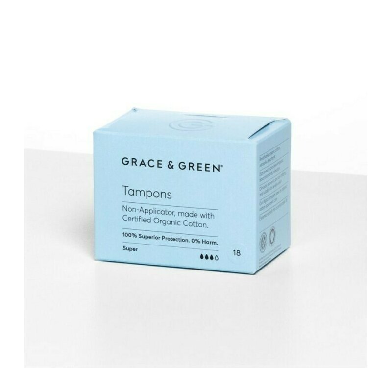 Tampoane din bumbac organic 100% Super (18 buc), Grace and Green Tampoanele Grace and Green fara aplicator sunt fabricate din 100% bumbac organic certificat, si impachetate in hartie reciclabila. Sunt create in trei dimensiuni diferite, oferind o protectie naturala si delicata. De ce sa alegi tampoanele Grace and Green? * Confectionate dintr-un material natural, respirabil si absorbabil * S-a dovedit prin studii clinice ca nu provoaca iritatii * Eficiente, proiectate cu 8 caneluri pentru a oferi o protectie imbunatatita * Sigure pentru organism si mediu * Confortabile si delicate * Practice si usor de utilizat Tampoanele Grace and Green fara aplicator sunt disponibile sub 3 dimensiuni diferite – Normal, Super si Super Plus, pentru a fi potrivite in functie de abundenta fluxului menstrual. Produsele Grace and Green sunt fabricate din materiale naturale, din surse sustenabile, eficiente in absorbtia imediata a lichidelor. Absenta materialelor sintetice si inutile permite pielii sa respire si sa ramana uscata, rezultand astfel o senzatie de confort si prospetime. Toate produsele si ambalajele Grace and Green sunt compostabile si reciclabile.